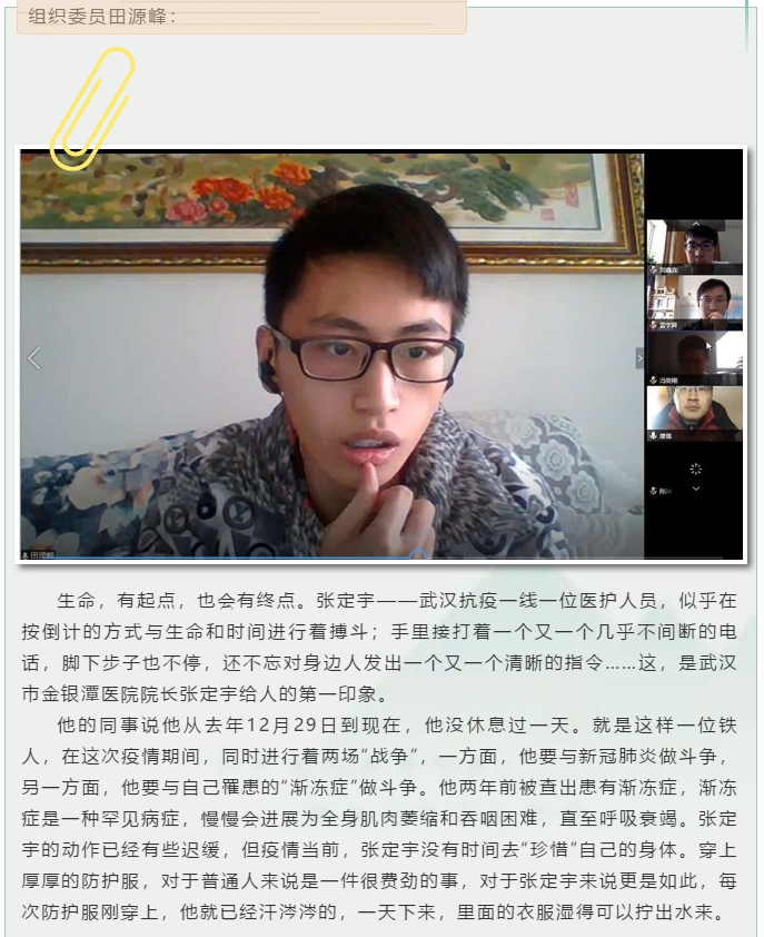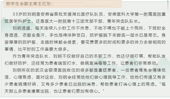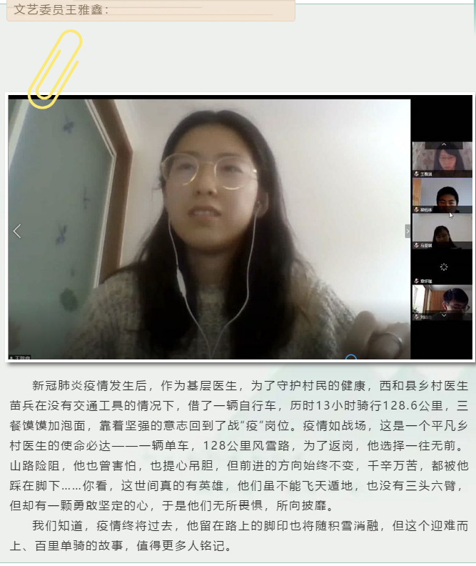随后,王雅鑫、田源峰、王红东、王楷淇同学讲述了在疫情防控斗争中涌现出的先进人物和事迹,“舍小家、顾大家、为国家”的感人故事。