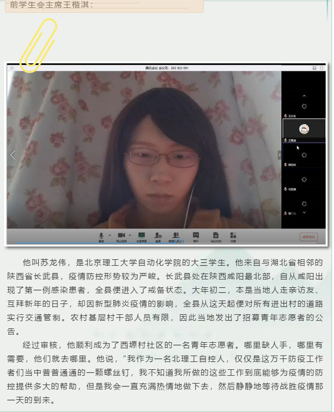 学习委员张耀文同学为我们分享了北理工的师生在本次疫情防控工作当中的奉献和担当。