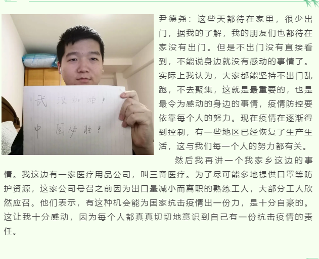 在活动的最后,团支书号召大家共同在通话中喊出加油口号,为一线医护人员加油,为祖国加油: