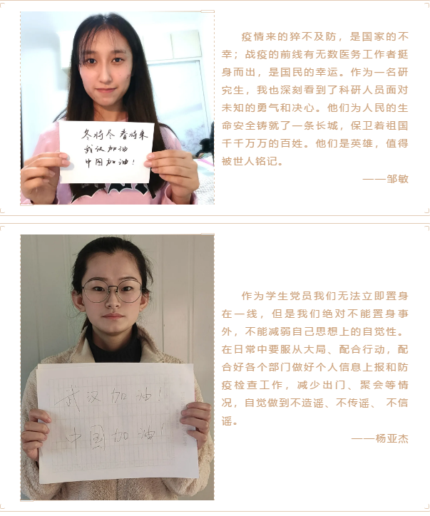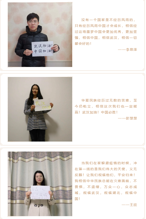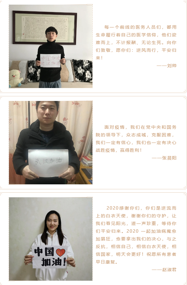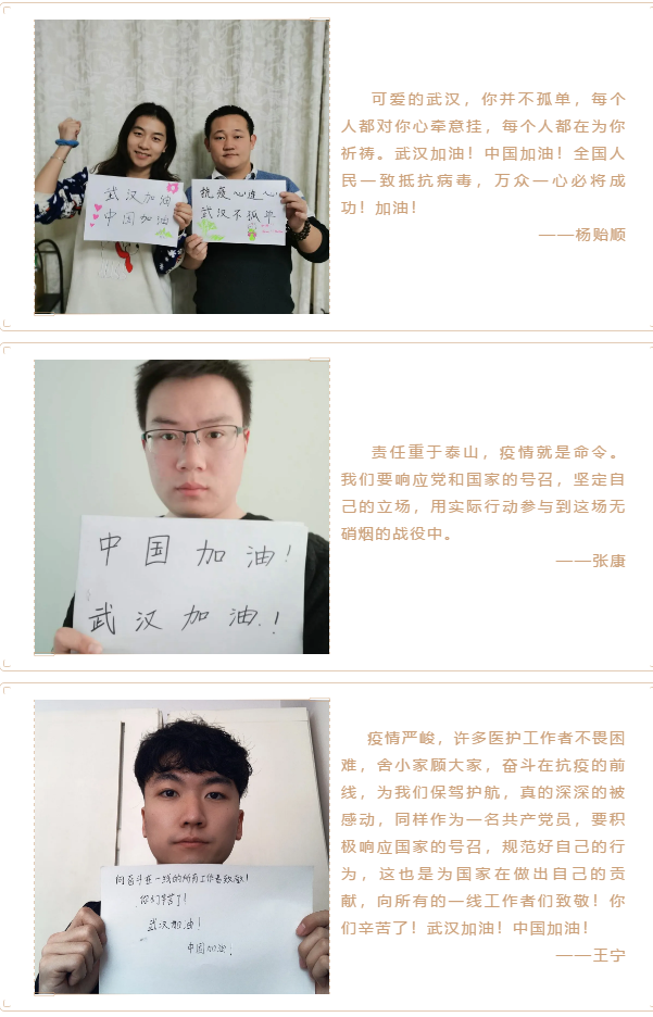 向一线抗击疫情工作人员表达敬意,坚定必胜信心,太阳集团城娱87222017级硕士团支部开展了“众志成城 中国加油”主题团日活动,向疫区一线工作人员送上祝福。