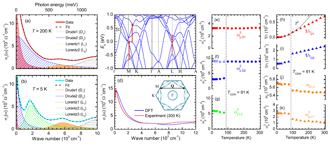 The mechanism of CDW in CsV3Sb5 materials and especially the relationship with superconductivity have always been the focus of attention. The CDW in CsV3Sb5 was extensively studied by infrared spectroscopy. It is found that above TCDW = 91 K, the low-frequency photoconductivity of the material exhibits a clear Drude response, which is consistent with the metallicity of the material. Typical optical signatures of charge density waves are observed below the TCDW. Further by performing Drude-Lorentz fitting on the photoconductivity spectra at all temperatures, as shown in Fig. 4. It is found that the CDW energy gap opens at the saddle point of the M point, while neither the electron band near the Γ point nor the Dirac band near the K point is affected. This result suggests that the nesting of the saddle point at M point through the wave vector Q may be the driving mechanism of the charge density wave in CsV3Sb5. This work was published in PRB [Phys. Rev. B 104, L041101 (2021)] as a letter and was selected as an Editors’ Suggestion. They then measured the resistivity of CsV3Sb5 in the c-axis (as shown in Fig 5), where the current is along the c-axis and is always perpendicular to the magnetic field, which is parallel to the ab plane and rotates within the plane. It can be seen that the resistivity versus angle under various magnetic field has obvious two-fold symmetry, which destroys the in-plane six-fold (or triple) symmetry of the crystal structure. When the applied magnetic field is less than 2.4 T (corresponding to the superconducting state) and larger than 2.4 T (corresponding to the normal state), the magnetic field directions corresponding to the minimum resistivity values are perpendicular to each other, indicating that the superconducting state and the normal state have two-fold symmetry perpendicular to each other. The relationship of these two kinds of two-fold symmetries with temperature was further investigated, and the results are shown in Fig. 6. It can be seen that the two-fold symmetry resistance corresponding to the superconducting state at low magnetic field disappears rapidly around the superconducting transition temperature, while the one measured in the normal state at high magnetic field weakens as the temperature increases, and transitions at the CDW. These results greatly enrich the understanding of this Kagome superconducting material and its physical properties. The results were published in Nature Communications [Nat. Commun. 12, 6727 (2021)].