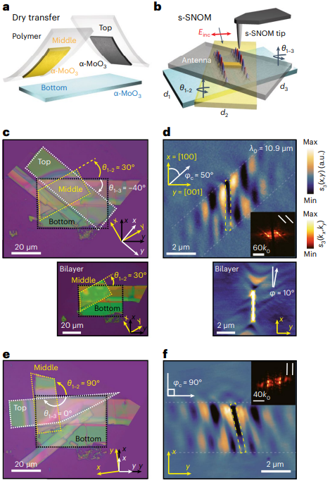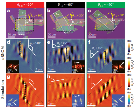为了在实验上直接观测三层氧化钼晶体中转角对纳米红外光场无衍射传播的调制作用,研究人员采用了散射型扫描近场光学显微镜(s-SNOM)来表征三层转角氧化钼晶体的近场光学分布。从图3中可以看到:在三层转角氧化钼晶体中存在多个光学魔角,不同光学魔角下纳米红外光场沿不同方向低损耗、无衍射传播,与之前的理论研究一致。也就是说,通过改变转角可以在三层氧化钼晶体中实现纳米光场无衍射传播方向的面内全角度调控。