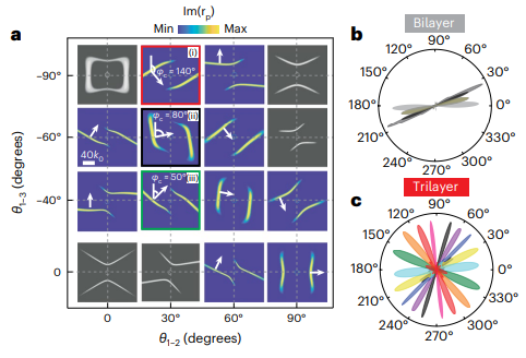 通过构建多层转角结构普适的理论模型,研究人员发现三层转角氧化钼晶体中极化激元无衍射传播方向强烈依赖于转角。如图2所示,当转角(θ1-2为第一层和第二层氧化钼晶体之间的转角,θ1-3为第一层和第三层氧化钼晶体之间的转角)发生改变时等频线法线方向也在发生变化(例如θ1-2 =30°, θ1-3 =-40°时法线与竖直方向夹角为φc=50°,而θ1-2 =30°, θ1-3 =-60°时φc=80°),即可以通过改变三层氧化钼晶体转角实现纳米红外光场低损耗、无衍射传播的面内全角度调控。可以看到,在双层转角氧化钼晶体中通过改变材料层厚、入射光频率等多个参数仅能在0-30°的范围内实现纳米光场无衍射传播方向的调控。然而,三层转角氧化钼晶体中通过改变转角(相同的三层氧化钼晶体,不改变材料层厚)可以实现纳米红外光场无衍射传播方向的面内全角度(0-360°)调控。