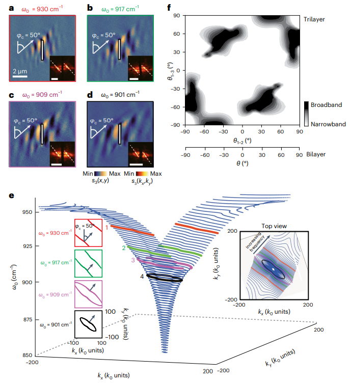 除此之外,理论研究还表明,三层转角氧化钼晶体中极化激元等频线可以在很宽的频率范围(870 cm-1-940 cm-1)内表现为平行直线(无衍射传播)。如图4所示,研究人员采用s-SNOM获得了不同入射光频率下三层转角氧化钼晶体的近场光学图像。当入射光频率从901 cm-1变化至930 cm-1时,近场光学图像与理论预言一致:金纳米天线激发的极化激元表现为沿着φc=50°的方向高度定向传播(无衍射损耗)。这说明在三层转角氧化钼晶体中光学魔角具有光谱鲁棒性,可以在宽光谱范围内实现红外纳米光场的高度定向传播。