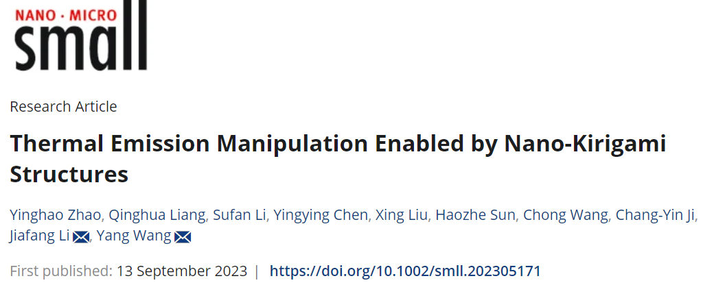 近日,太阳集团城娱8722汪洋研究员、李家方教授团队在动态热辐射超表面研究方面取得重要进展,该工作基于纳米剪纸结构通过多物理场调控的方式实现了红外热辐射的强度和峰值波长的原位调控,并探索了它在动态热管理、能源转换方面的应用潜力。相关研究成果以“Thermal Emission Manipulation Enabled by Nano-Kirigami Structures”为题发表在Small期刊[Small, 2305171 (2023)]上。该研究工作得到了国家自然科学基金委、国家重点研发计划和北京市自然科学基金的资助。