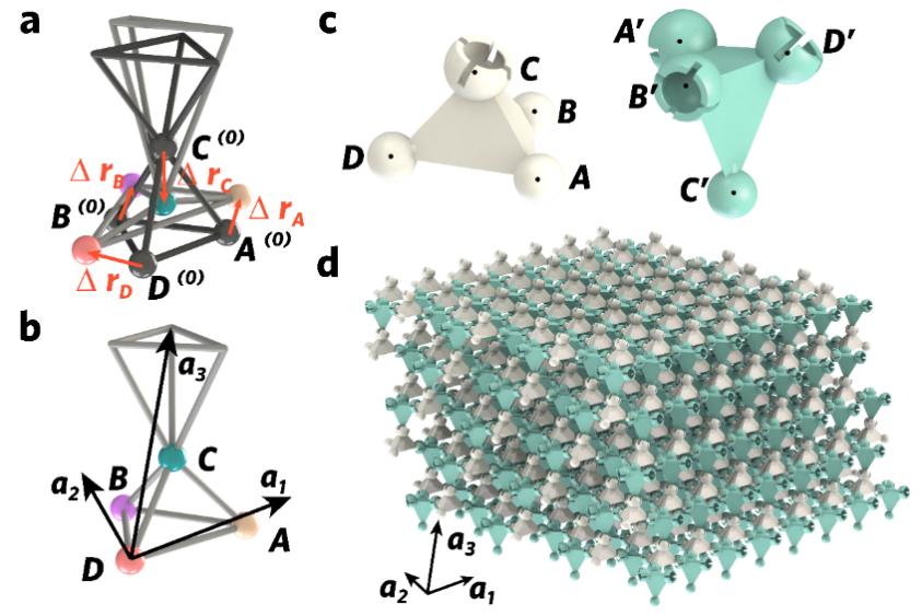 图1 三维完全极化静力学拓扑绝缘体的设计原理。(a)-(b)正规焦绿石晶格和广义焦绿石晶格的原胞。 (c) 白色和绿色刚体分别表示组成广义焦绿石晶格原胞的底部四面体和顶部四面体。 (d) 组装后的三维完全极化静力学拓扑绝缘体。