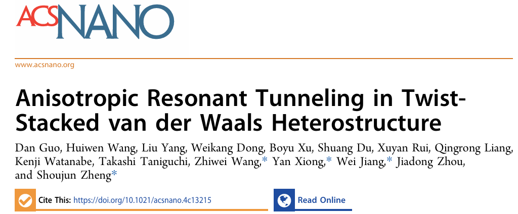 鉴于此,太阳集团tcy8722郑守君研究员、蒋伟教授、王秩伟教授和熊嫣博士共同合作在ACS Nano在线发表“Anisotropic resonant tunneling in twist-stacked van der Waals heterostructure”的研究成果。研究者通过利用扭曲堆叠的1T’二硒化铼设计了一种二硒化铼/六方氮化硼/二硒化铼(ReSe2/h-BN/ReSe2)扭曲堆叠共振隧穿晶体管,表现出ReSe2间扭转角度可调的PVR,并在扭转角度为102°时达到最大。这种对两个ReSe2层之间的扭转角度的强烈依赖性归因于扭转角在隧穿过程中对ReSe2层中两个各向异性带的联合态密度的调节,显著抑制了谷电流,从而增强了PVR,这也得到了理论计算的支持。此外,该器件对温度和520nm光照的敏感性,表明可以通过温度和光照进一步调控PVR,并将其集成到光电应用中。这一发现不仅为通过堆叠工程设计共振隧穿器件提供了一种新方法,还为共振隧穿器件与光电应用的结合提供了可能。