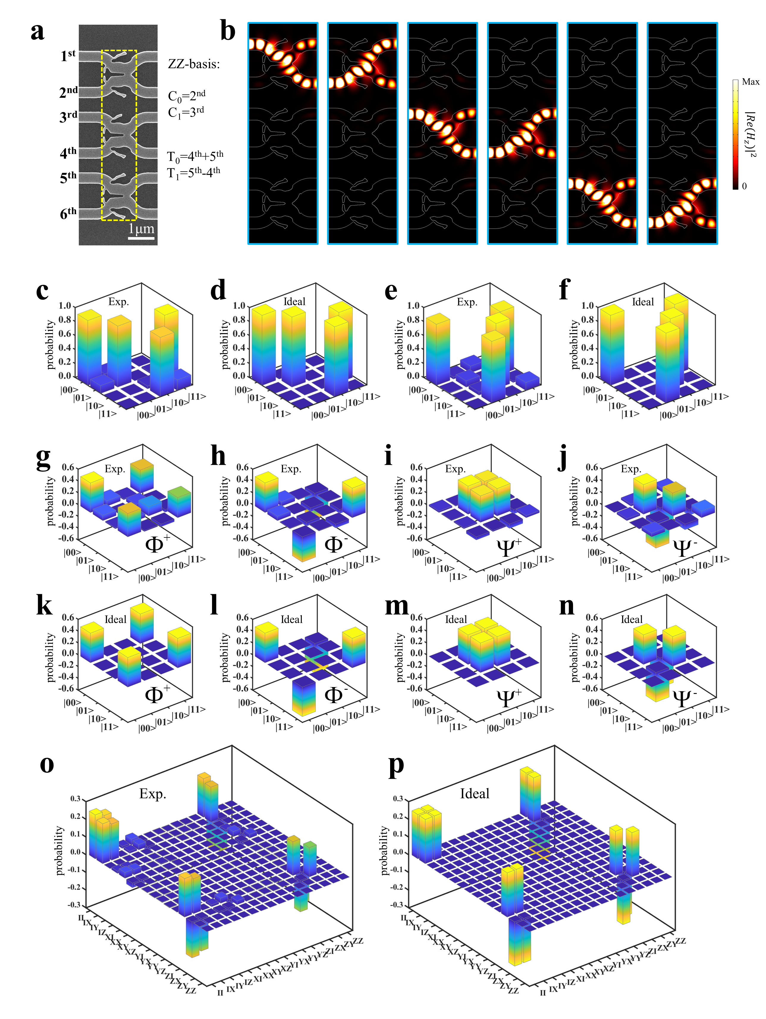 为了测试所设计的超紧凑量子回路的功能,研究人员进行了单光子态演化的数值模拟。图4b和图4d展示了单光子态从第一个和第二个波导激发的概率幅的平方。从第一到第四个波导的输出态的相应的概率幅平方标记为图4c和图4e中的红线。同时,这四个波导的输出叠加态的概率幅的平方的理论结果被标记为图中的蓝色矩形。比较这些结果,可以发现理论和数值模拟之间的一致性很好,这表明即使将量子回路集成到如此小的尺寸中,量子回路的功能也可以很好的被执行。