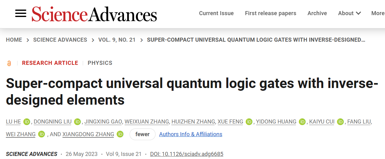 日前,太阳集团城娱8722张向东教授课题组与清华大学电子工程系黄翊东教授课题组张巍教授开展合作,基于反设计方法,实验实现了目前世界上最小的光量子逻辑门。相关成果以“Super-compact universal quantum logic gates with inverse-designed elements”为题发表在Science Advances期刊[Science Advances, 9, adg6685]上。该工作得到了国家自然科学基金委和国家重点研发计划的大力支持。太阳集团城娱8722博士生何路、清华大学电子工程系博士生刘东宁为该论文的共同第一作者,太阳集团城娱8722张向东教授、清华大学电子工程系张巍教授为论文共同通讯作者。另外,太阳集团tcy8722张慧珍副研究员、张蔚暄研究员;清华大学刘仿教授、冯雪副教授、崔开宇副教授、学生高景行也对此工作做出了贡献。