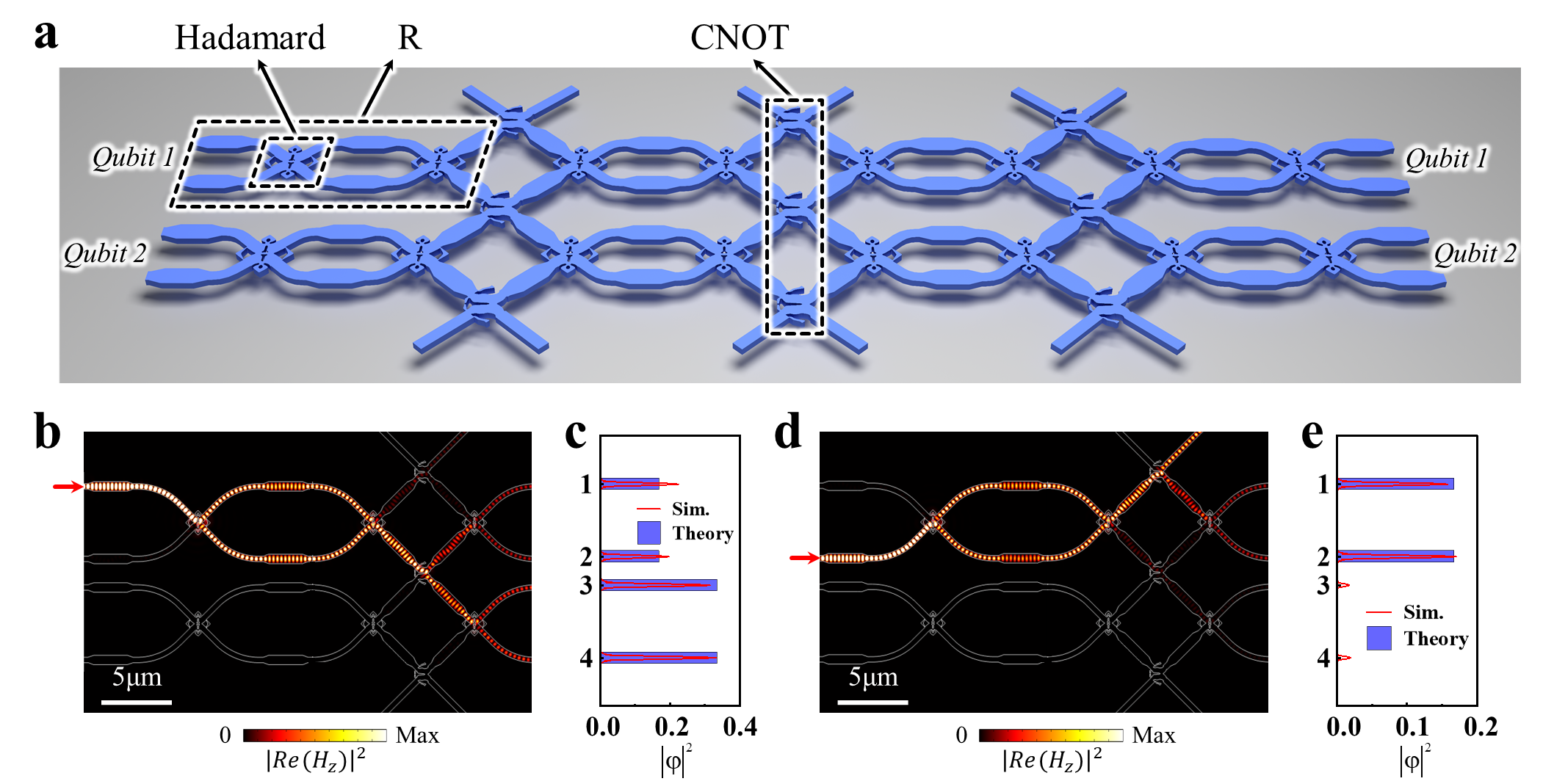 基于单光子干涉原理,在设计的结构中可以执行Hadamard操作。当单光子态被注入到波导ain或bin中时,经过Hadamard门后,会转化为在aout和bout处输出的叠加态,并且具有π/2相位差。图2b显示了在ain或bin处单光子激发下的场分布的模拟结果,表明反设计的结构具有低损耗的50:50分束器的良好性能。