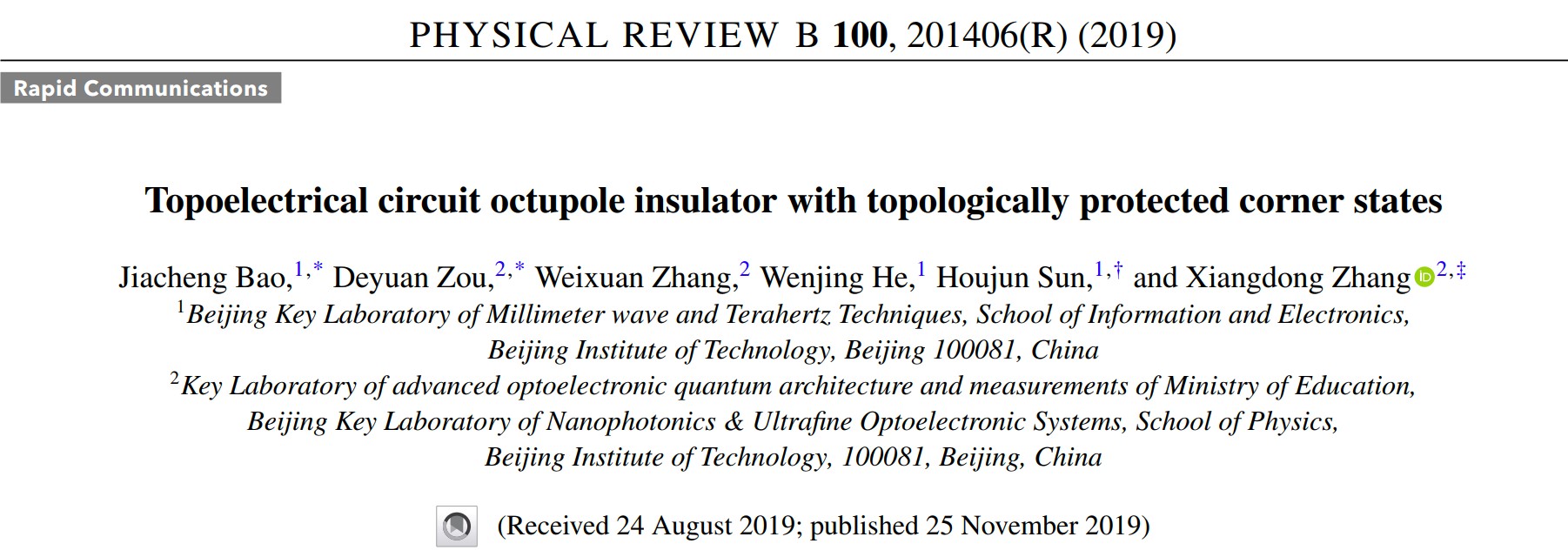 2019年11月,相关工作在Phys. Rev. B上以Rapid Communications的形式发表[Phys. Rev. B, 100 201406(R) (2019)]。太阳集团tcy8722信息与电子学院博士生包嘉诚和太阳集团城娱8722博士生邹德源为论文的共同第一作者。值得指出的是,在上述工作发表后,八极子拓扑绝缘体进一步在声学[Nat. Commun. 11 2108 (2020), Nat. Commun. 11 2442 (2020)]和电路系统[Light: Science & applications 9 145 (2020)]中进一步得到了验证。