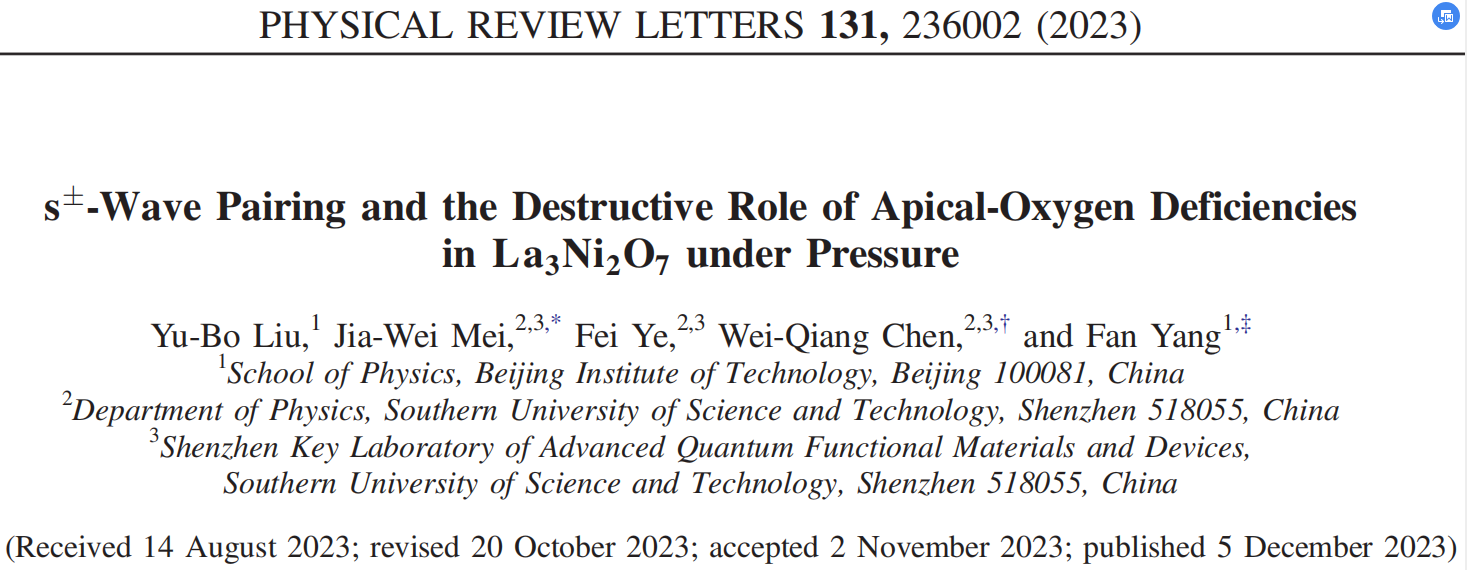 该工作相关论文”s±-Wave Pairing and the Destructive Role of Apical-Oxygen Deficiencies in La3Ni2O7 under Pressure” 在国际顶尖刊物《Phys. Rev. Lett》上发表,获得国际学术界的广泛认同和跟进,成为目前该研究领域的重要理论研究之一[arXiv上已被引用30余次]。杨帆教授指导的博士生刘玉波博士为论文的第一作者。杨帆教授与南方科技大学陈伟强教授、梅佳伟教授为该论文的共同通讯作者;参与论文工作的还有南方科技大学叶飞教授。工作得到国家自然科学基金重点项目、面上项目的支持。