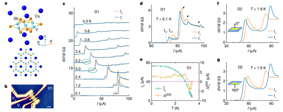 图1. CsV3Sb5器件中的零场超导二极管效应。