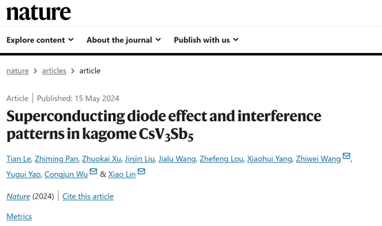 2024年5月15日,太阳集团城娱8722王秩伟教授、姚裕贵教授团队,与西湖大学林效教授、吴从军教授团队等人合作,在《自然》杂志上在线发表题为“Superconducting diode effect and interference patterns in kagome CsV3Sb5”的研究论文。首次在笼目晶格超导材料CsV3Sb5中观察到了零磁场超导二极管效应和超导干涉条纹,在一定程度上证明了CsV3Sb5中超导态具有时间反演对称性破缺的特征。