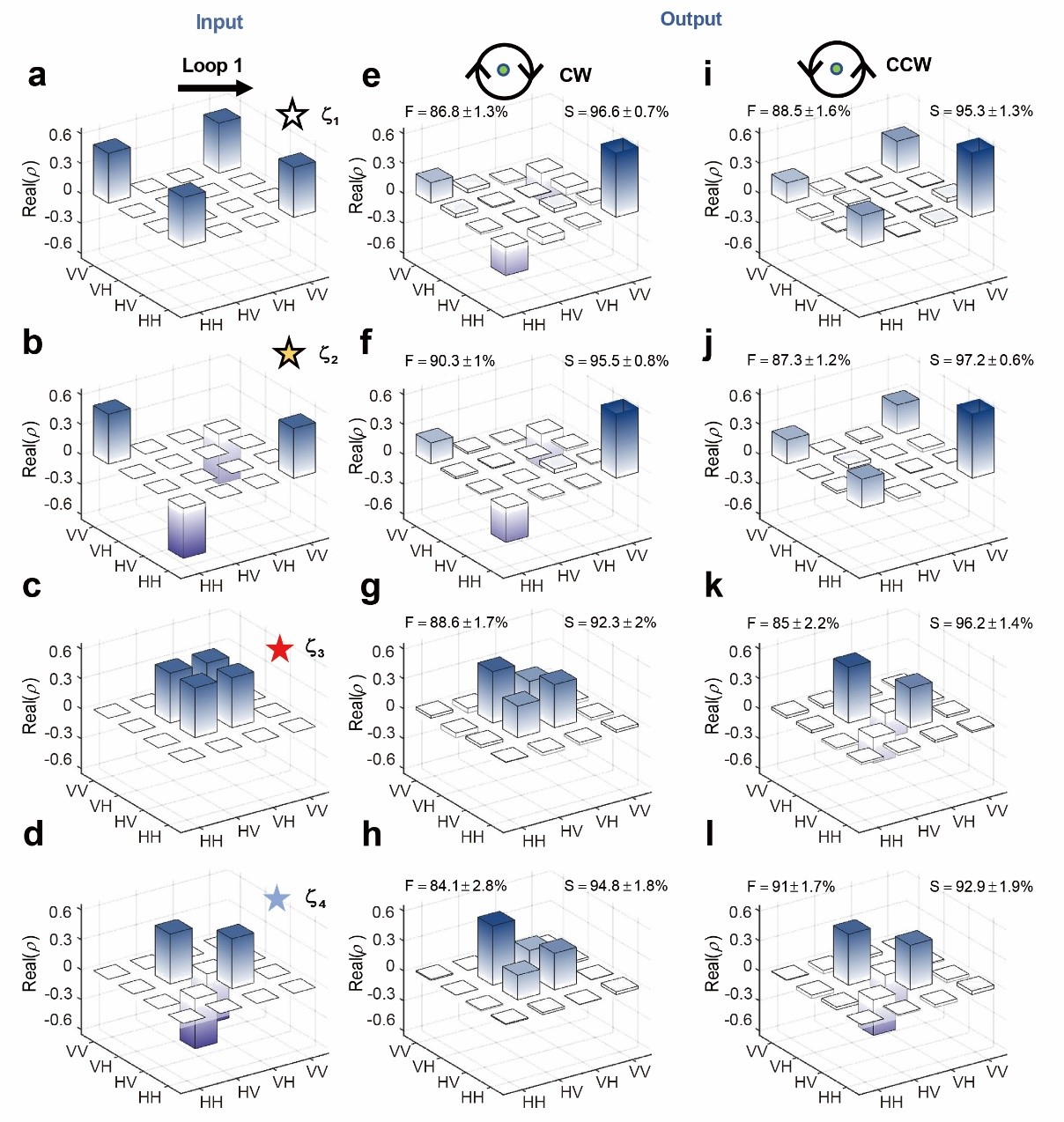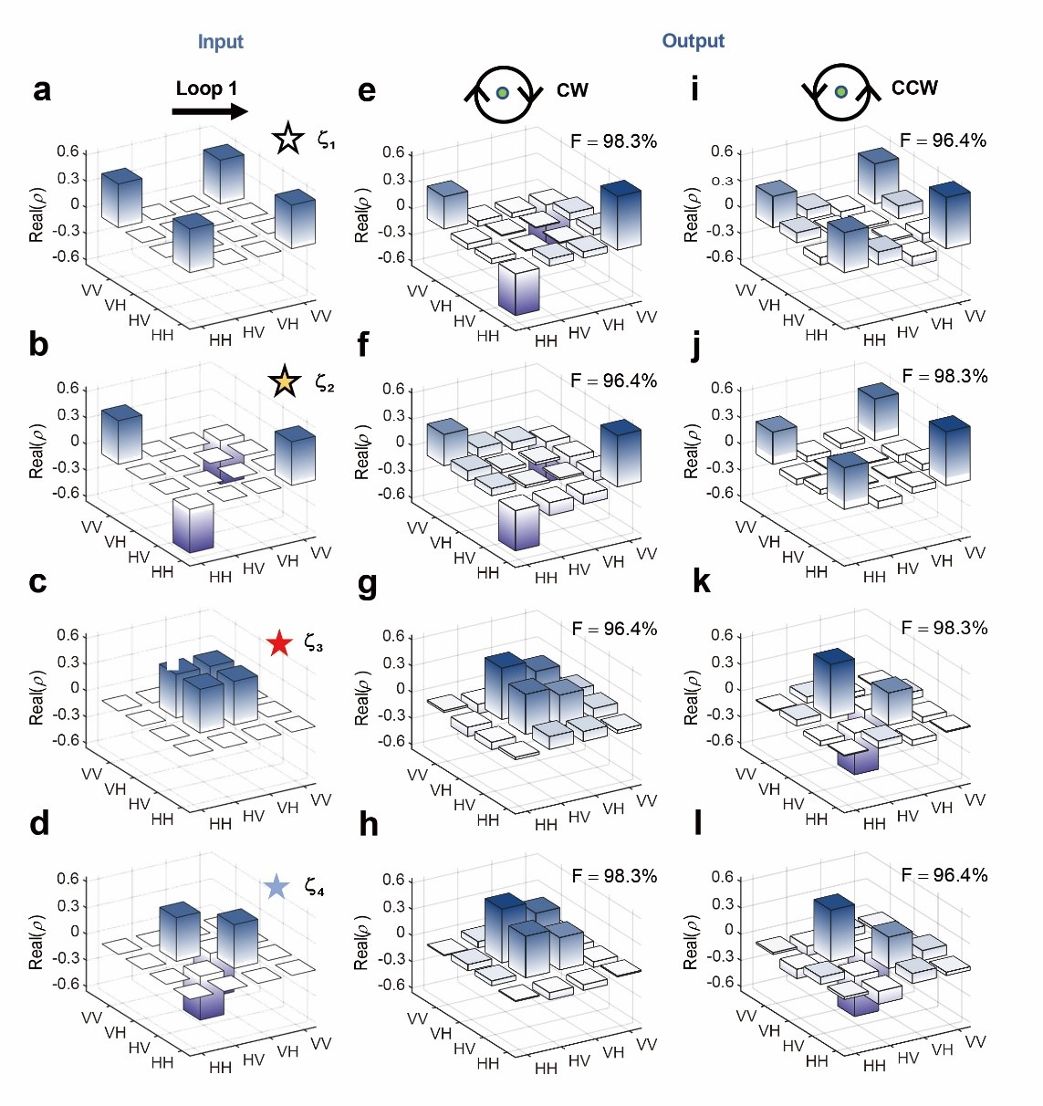 四个输出态的理论密度矩阵如图 2 所示。图 2e-2h 对应的是顺时针变化的情况,而图 2i-2l 对应的是逆时针变化的情况。为便于比较,图 2a-2d 显示了输入状态的密度矩阵。图 2a-2d 中的白色、黄色、红色和蓝色星号与图 1b 中标注的星号相对应,分别代表输入态