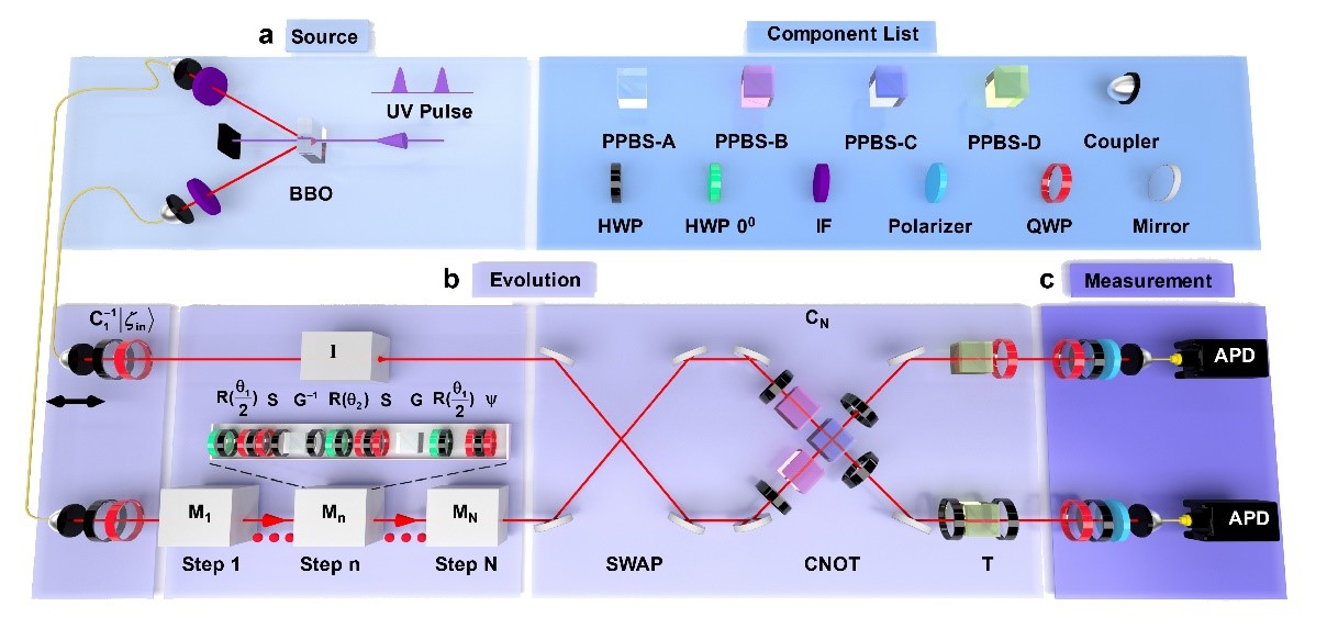 作用于四个贝尔态可以得到易于精确制备的输入态,研究人员便通过半波片和四分之一波片来直接实现,然后将它们送入多步演化模块中。