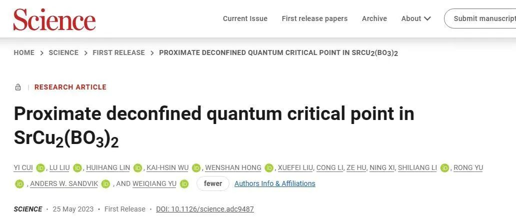 近日,太阳集团城娱8722刘录助理教授与中国人民大学理学院物理学系于伟强课题组和俞榕课题组、美国波士顿大学 Anders W. Sandvik 课题组、中国科学院物理研究所李世亮课题组等合作在《科学》杂志上发表论文“Proximate deconfined quantum critical point in SrCu2(BO3)2”。他们在一种准二维阻挫量子磁性材料中,借助高压、强磁场、极低温的调控和核磁共振谱学测试,发现了一种超越朗道相变理论范式的新型量子相变现象,即解禁闭量子临界,并首次给出了解禁闭量子临界点附近量子临界行为的确凿实验证据。