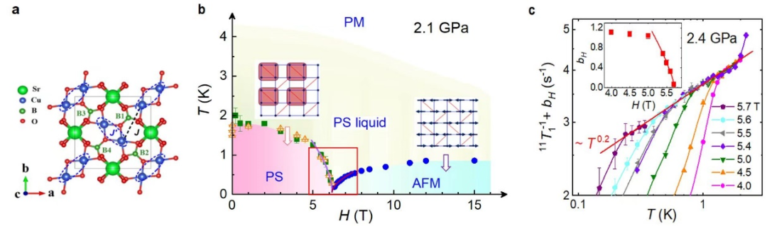 近年来随着分数量子霍尔效应的实验发现和量子自旋液体概念的提出,物理学家对朗道相变理论是否可以统一描述所有物态间的相变产生了疑问,引起了强关联电子领域众多国际知名专家的关注与研究。其中一个重要问题是在两种自发对称破缺态之间是否有连续的量子相变。以磁驱动的价键固体态和反铁磁态间的相变为例,由于两种态分别自发破缺了晶格平移和自旋旋转两种互不相容的对称性,在朗道相变理论框架下,它们之间只能发生一个不连续的一级相变;然而在本世纪初,一些理论学家提出该相变可能是连续的,即超越朗道理论范式的解禁闭量子临界,在其附近呈现出新奇的解禁闭分数化元激发。这些理论工作为量子相变的研究打开了一个全新的方向,然而尚缺乏实验证据的支持。非常有趣的是,准二维阻挫磁性材料SrCu2(BO3)2(图一a)在压强调控下,基态可能呈现规则的价键固体态,是研究价键固体—反铁磁相变的理想实验平台。