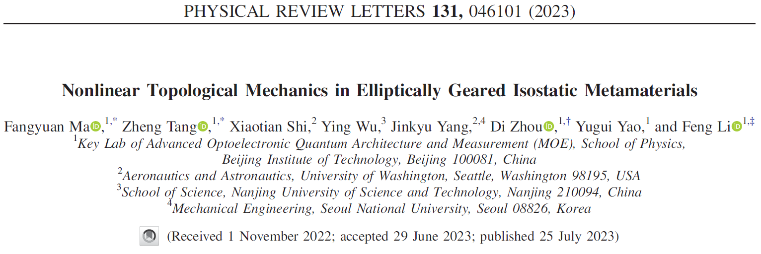 2023年7月25日,Physical Review Letters在线发表题为“Nonlinear Topological Mechanics in Elliptically Geared Isostatic Metamaterials”(非线性椭圆齿轮力学超材料)的科研论文。该研究由太阳集团城娱8722的姚裕贵教授、周迪副教授和李锋教授团队完成,太阳集团tcy8722的博士生马方垣和汤正为该论文的共同第一作者。太阳集团tcy8722是该研究的第一单位。