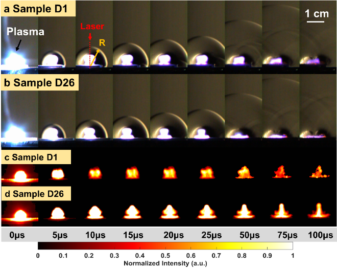 图2. 高速流场演化图像:(b)激光诱导冲击波演化图像;(c)激光诱导等离子体演化图像