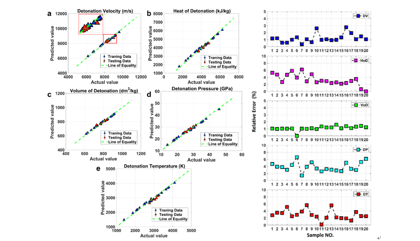 图4. (左)模型预测图:(a)爆速;(b)爆热;(c)爆容;(d)爆压;(e)爆温