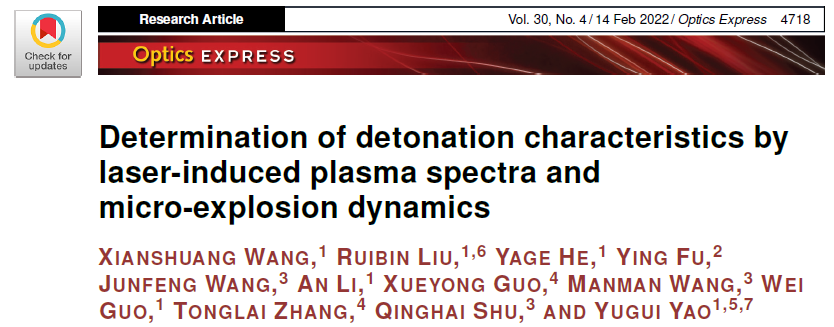 物理机制探索:弄清了激光与含能材料相互作用的微观物理机制,及超快等离子体过程和微爆动态物理化学过程相关演化机理,证明了激光微爆过程与宏观爆轰存在的强关联物理特性,并提出了微爆动力学物理模型,如图1所示。因此,可以通过对微爆过程的精密物理测量和分析,完成对含能材料爆速、爆压、生成焓等参数的定量分析以及爆温的预测。该成果发表在光学顶级期刊Optics Express上(Opt. Express, 2022, 30(4): 4718-4736.)