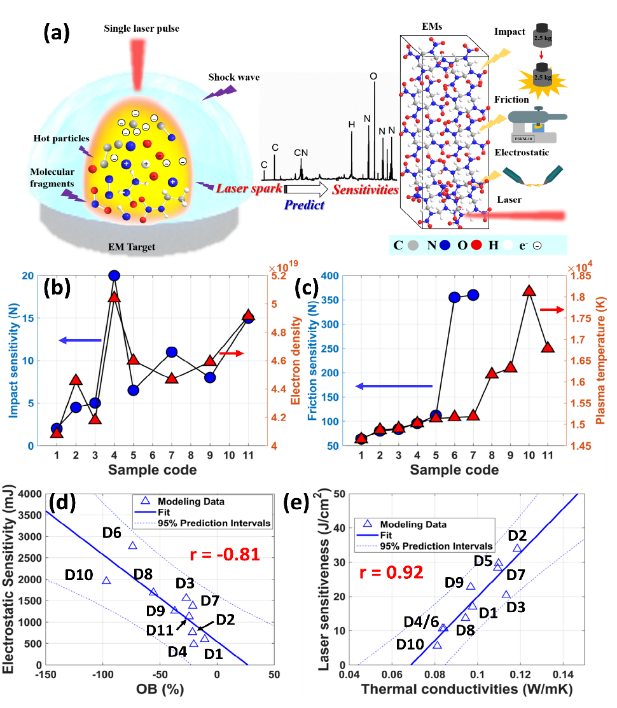 图5. 激光等离子体与感度关联性分析图:(a)基于激光等离子体光谱的感度预测机理;(b)电子密度和撞击感度关联图;(c)等离子体温度和摩擦感度关联图;