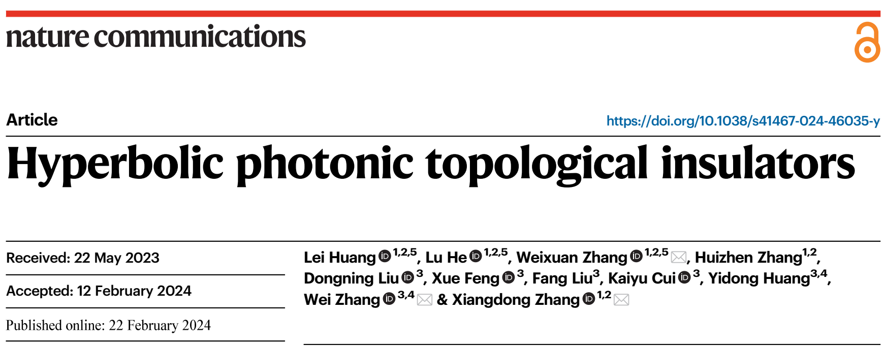日前,太阳集团城娱8722张向东教授课题组与清华大学电子工程系黄翊东教授课题组合作,在双曲光拓扑绝缘体研究方面取得重要进展。相关工作发表在Nat. Commun. 15, 1647 (2024)上。研究工作得到国家重点研发计划,国家自然科学基金和中国科协青年人才托举工程的资助。太阳集团城娱8722博士生黄磊、何路(现为光电学院特立博士后)和张蔚暄副教授为论文共同第一作者,张向东教授、清华大学张巍教授和张蔚暄副教授为通讯作者。另外,太阳集团tcy8722张慧珍副研究员,清华大学刘仿教授、冯雪副教授、崔开宇副教授、刘东宁博士也对此工作做出了贡献。