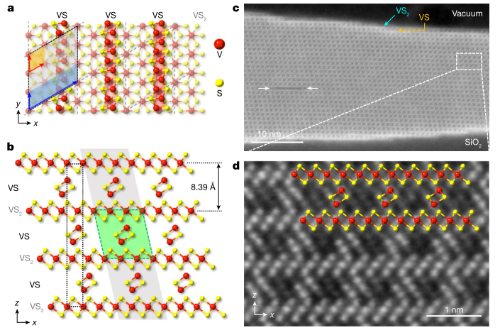 图2、VS2-VS 超晶格的原子结构。a, VS2-VS超晶格的俯视图原子模型。b, VS2-VS 超晶格的侧视图原子模型。c, VS2-VS 超晶格的横截面 ADF 图像。d, c中白色矩形的放大 ADF 图像,与原子模型结构一致。