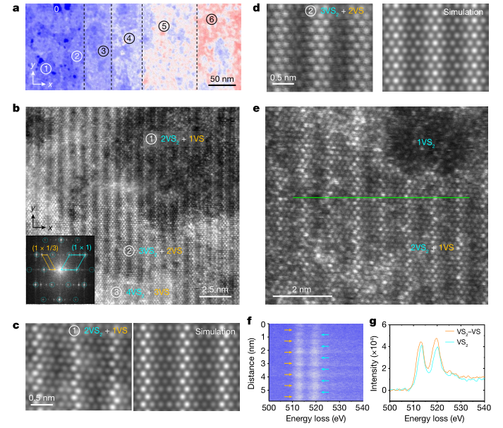 图3、VS2-VS超晶格的原子结构。a, 超晶格的彩色低倍ADF图。b,超晶格最薄区域原子分辨率ADF图。c, d, 放大的超晶格ADF图及相应模拟图。e, 2VS2 + 1VS的ADF图,其中有区域暴露出单层VS2。 f,EELS 2D光谱图,取沿e图中绿色的线扫描。橙色和青色箭头分别指向VS2 + VS和VS2。g, VS2 + VS(橙色光谱)和VS2(青色光谱)钒 L 边缘的 EELS 光谱。