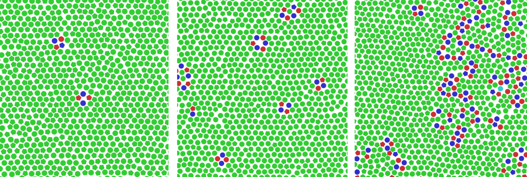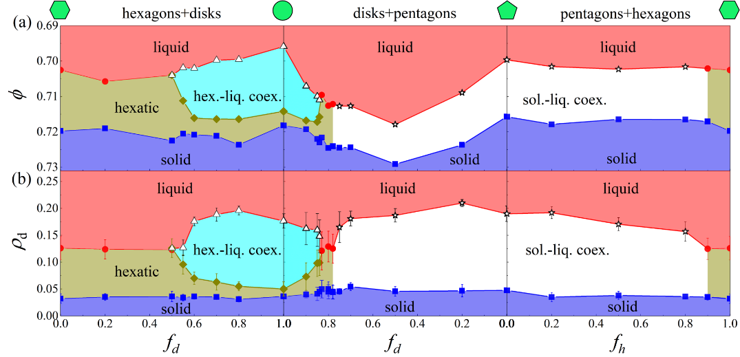 图1. 圆形-正五边形二组分混合体系中固相(左),六角相(中),固-液共存相(右)中的缺陷(红色和蓝色)分布。红色、绿色、蓝色分别代表粒子有5、6、7个近邻。