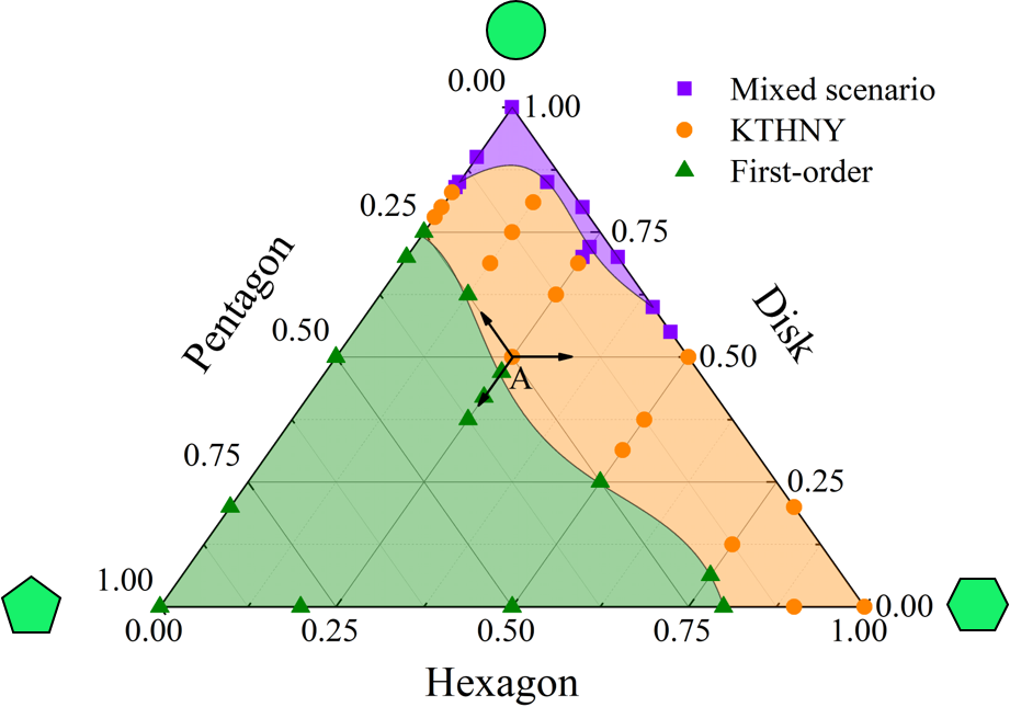 在二组分体系中(图2上栏 ),混合圆形及正六边形粒子及混合正五边形和正六边形粒子,体系的熔化机理均从一个单组分遵循的机理过渡到另一个单组分遵循的机理;而混合正五边形及圆形粒子,我们发现混合体系可遵循不同于两个单组分机理的KTHNY连续相变机理,且此混合体系为低共熔混合物体系。我们进一步研究了体系拓扑缺陷(粒子的近邻数非6个)的演化,发现在当缺陷浓度大于0.046及大于0.123时(图2下栏 ),固相与六角相分别失稳,这提供了通过缺陷浓度判定相态的准则。我们进而建立了三元融化相图,发现KTHNY相变机理总是介于一级相变机理及混合机理之间。本工作为理解二维熔化机理提供了有益启示。