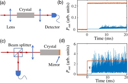 图1. 光学多体系统本征不稳定相的实验观测结果。(a)和(c)为实验装置,(b)和(d)为透射谱的测量结果。