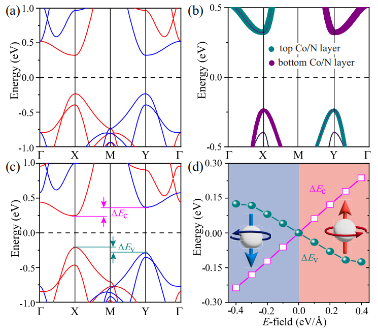 图3.单层Ca(CoN)2的电子结构分析:(a) 能带结构;(b) 轨道投影能带结构;(c) Ez="0.2" eV/Å电场下单层Ca(CoN)2的能带结构;(d) VBM (ΔEv)和CBM (ΔEc)随Ez的自旋(谷)劈裂。
