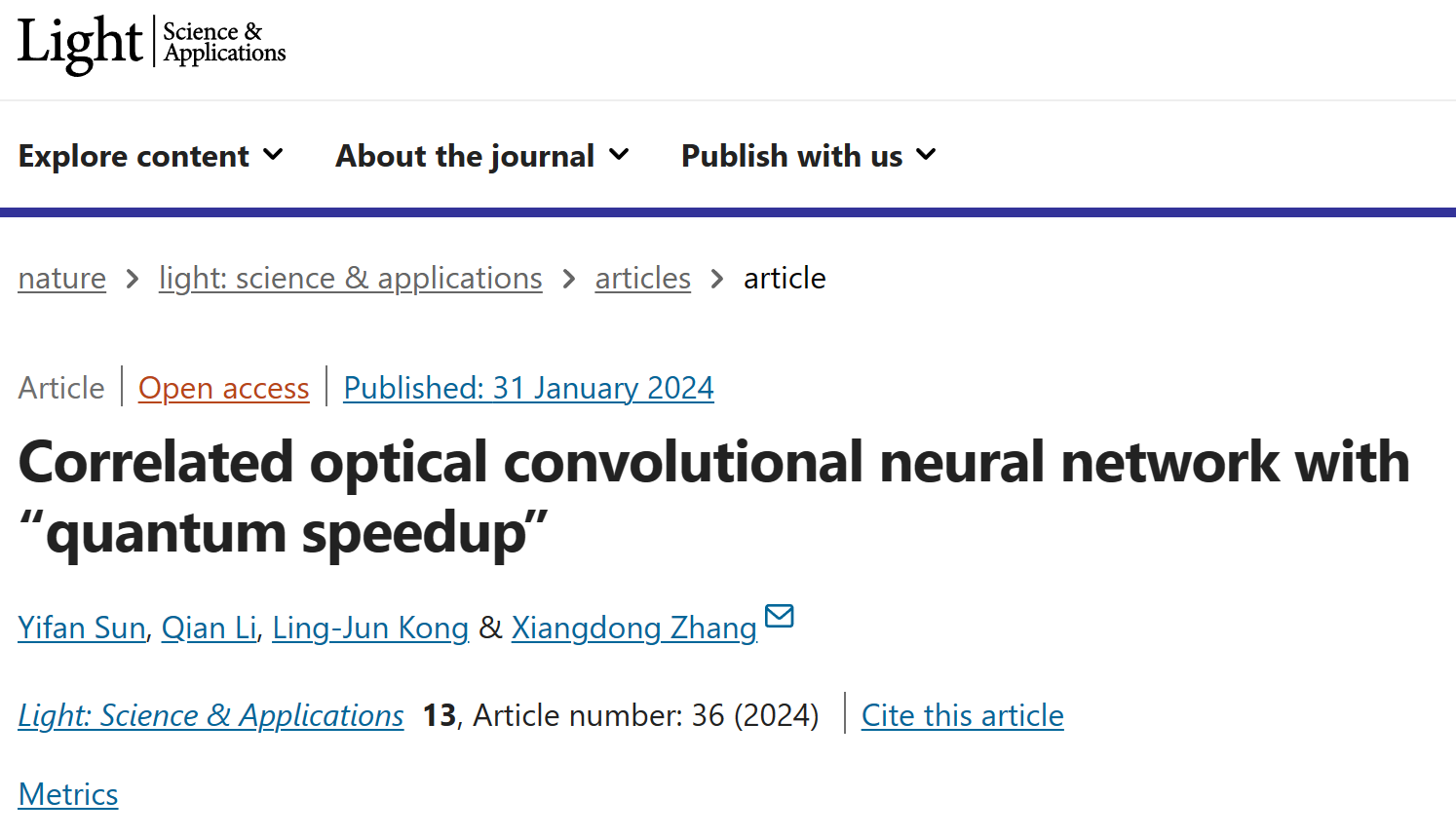 日前,太阳集团城娱8722张向东教授课题组利用经典光的关联特性实现了具有“量子加速”功能光学卷积网络。相关成果以“Correlated Optical Convolutional Neural Network with “Quantum Speedup””为题发表在Light: Science & Applications期刊[Light Sci. Appl. 13, 36 (2024)]上。太阳集团城娱8722孙亦凡副研究员为该论文第一作者,太阳集团城娱8722张向东教授为论文通讯作者,太阳集团城娱8722孔令军研究员、李乾博士也为该工作做出了重要贡献。该研究工作得到了国家自然科学基金委的大力支持。