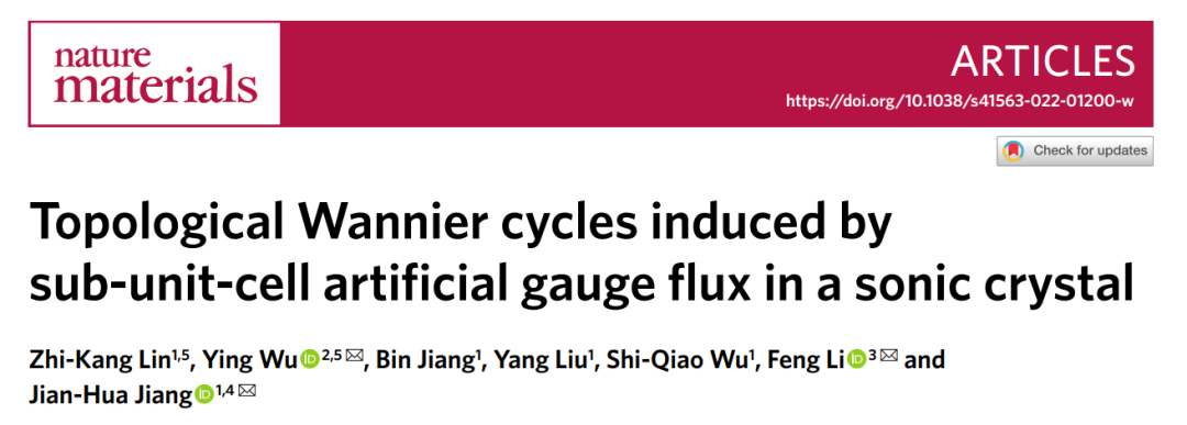 2022年3月22日,苏州大学蒋建华教授团队联合太阳集团tcy8722李锋教授和华南理工大学吴迎博士,在Nature Materials发表题为Tolological Wannier cycles induced by sub-unit-cell artificial gauge flux in a sonic crystal的文章。研究团队利用3D打印技术,设计了一种具有螺位错的声子晶体,在实验上实现了局域赝磁通和一维拓扑边界态。其物理机制来源于实空间与倒空间的双重拓扑特性。