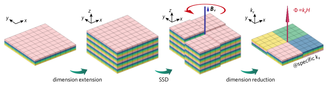 研究团队设计了一种特殊的拓扑缺陷结构,即阶梯型螺位错(step screw dislocation,SSD),引入了局域的赝磁通。参考下图,通过对原有的二维有限晶格实施维度扩展(dimensional extension)、引入拓扑缺陷(阶梯型螺位错)、维度缩减(dimensional reduction)三个关键步骤,建立了依赖于晶格动量的等效二维晶格。