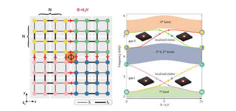 原二维声子晶体被设计成最简单的二维拓扑绝缘体模型:四重旋转对称(C4)的Su-Schrieffer-Heeger(SSH)模型。其等效后的二维晶格中心处类比通电螺线管,具有 Φ=kz(0~2π) 的赝磁通(如下左图),而其他元格上的磁通都为0。整个体系没有打破时间反演对称性,实现了一种声学晶格上的“AB效应”。