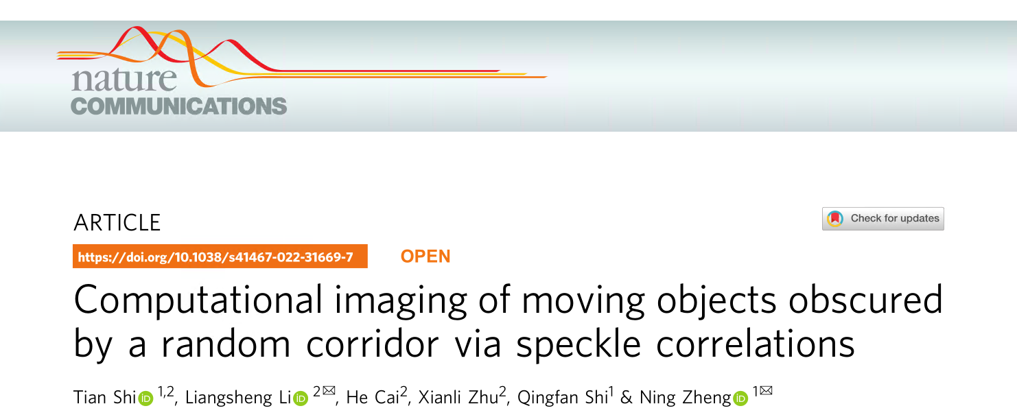 近日,太阳集团城娱8722郑宁教授团队和北京环境特性研究所的李粮生研究员团队,在《Nature Communications》发表题为 “Computational imaging of moving objects obscured by a random corridor via speckle correlations” 的文章。团队提出了一种新型的散斑关联方法,实现了对随机走廊(包含随机介质的曲折走廊)中隐藏目标的成像,同时定量分析了该方法的成像适用范围。太阳集团tcy8722的博士研究生石天为论文的第一作者,郑宁教授和李粮生研究员为论文的共同通讯作者。论文的合作者包括太阳集团tcy8722的史庆藩教授,北京环境特性研究所的工作人员蔡禾和朱先立。