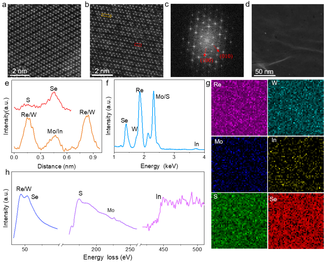 本工作采用以NH4ReO4, WO3, MoO3及 In2O3粉末压制所得的片材作为金属源前驱体,S和Se的混合粉末提供非金属源,C面蓝宝石作为衬底,在三温区低压系统中通过CVD法制备ReaWbMocIndSxSey六元中熵合金。通过光学照片可确认2英寸中熵合金薄膜的平整性和均匀性。原子力显微镜的结果表明中熵合金具有原子级的单层厚度(0.8 nm)。由于中熵合金单层的主体结构为ReS2,因此可推断出,其拉曼振动相对于ReS2的变化归因于W、Mo、In和Se等元素的引入。2英寸中熵合金晶圆上随机选取的7个位点的拉曼光谱和147 cm-1波数处的拉曼mapping表明中熵合金具有良好的均匀性。荧光光谱表明ReS2的带隙为1.44 eV,而中熵合金却发生了荧光的猝灭,这是由于W、Mo、In和Se等元素的掺杂引起的。