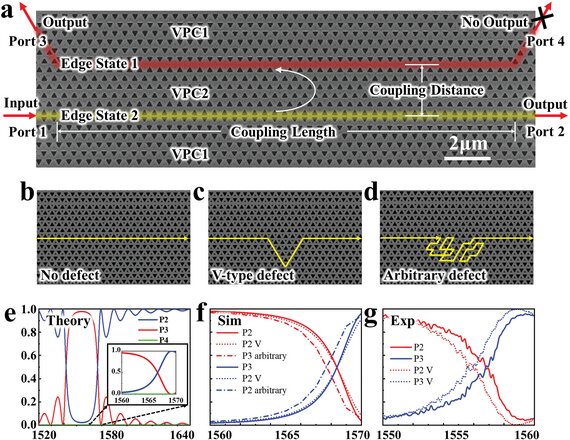 另外,通过绘制超胞的能带图(图1d),可以清楚地看到,在拓扑能隙中出现了两个边缘态,它们在K谷具有相反的正负群速度。由于有限尺寸效应,两个边缘态之间出现了打开的能隙,这表明它们之间发生了耦合。并且两个边缘态模式具有不同的传播方向,如图1e所示。利用拓扑边缘态的独特特性,研究人员设计了拓扑反向耦合器(topo-CDC)。这里,topo-CDC由三层拓扑谷光子晶体结构组成。图2展示了topo-CDC的SEM图像和理论实验透射率结构。由于topo-CDC的镜像对称性,在端口1和4入射时,端口2和3可以出射任意比例的光。这表明利用topo-CDC可以实现任意分束比的2×2光束分束。