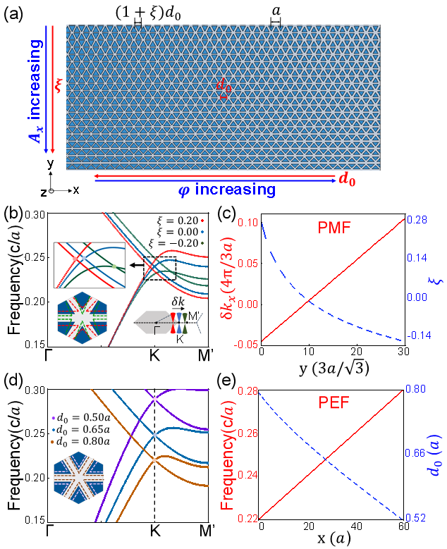 图2. (a)二维形变的蜂窝晶格光子晶体。(b-e)赝磁场和赝电场的构建。