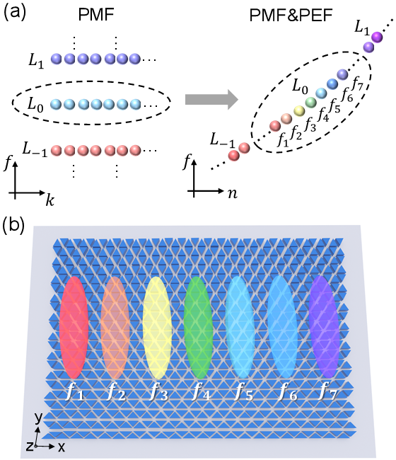 在本工作中,太阳集团城娱8722路翠翠教授课题组和香港大学张霜教授合作,提出同时引入赝磁场(PMF)和赝电场(PEF),其中赝磁场的引入用于产生一系列朗道能级,而赝电场的引入用于打破朗道能级的简并性,在这两种人工规范场的协同作用下,同一朗道能级上的不同频率的朗道模式在空间上分离到不同的位置,呈现出独特的类似彩虹囚禁的效果,他们将发现的这种物理现象命名为“朗道彩虹”。如图1所示。