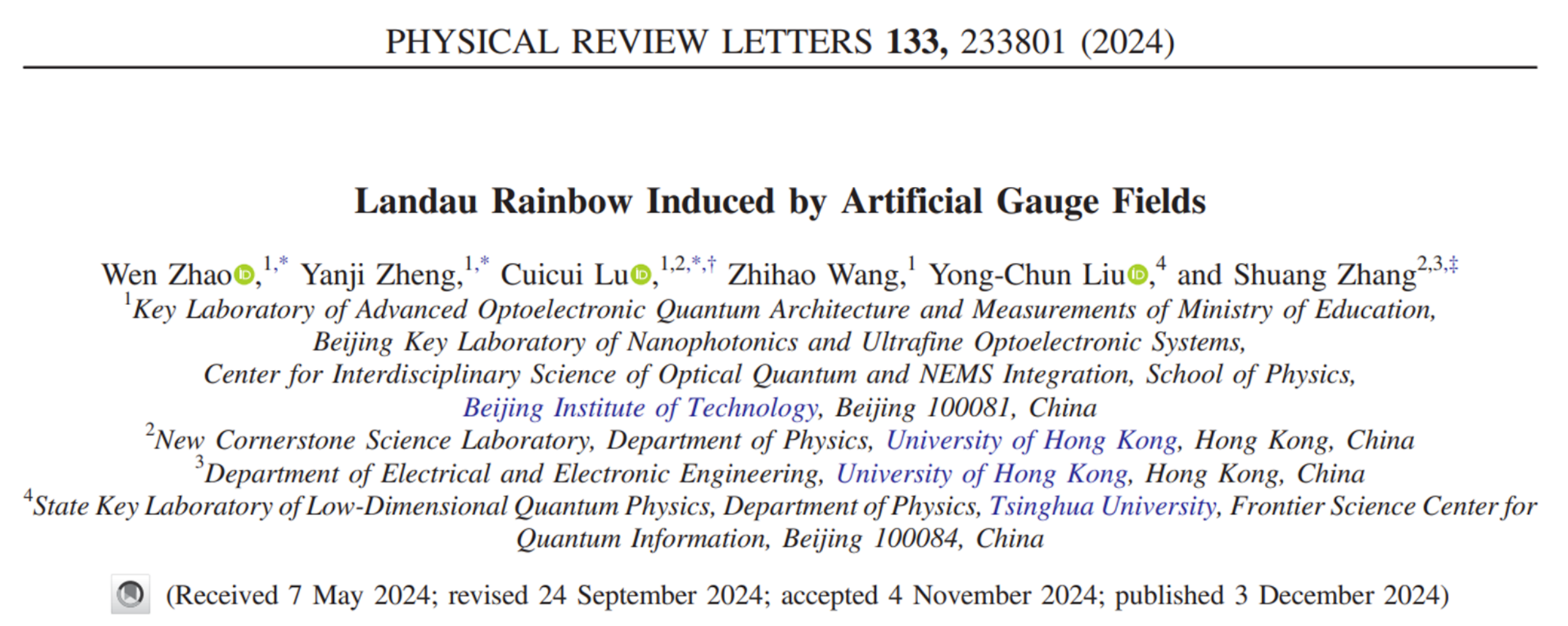 文章信息:Wen Zhao,# Yanji Zheng,# Cuicui Lu,#* Zhihao Wang, Yongchun Liu, and Shuang Zhang*; “Landau Rainbow Induced by Artificial Gauge Fields”, Physical Review Letters 133, 233801 (2024).