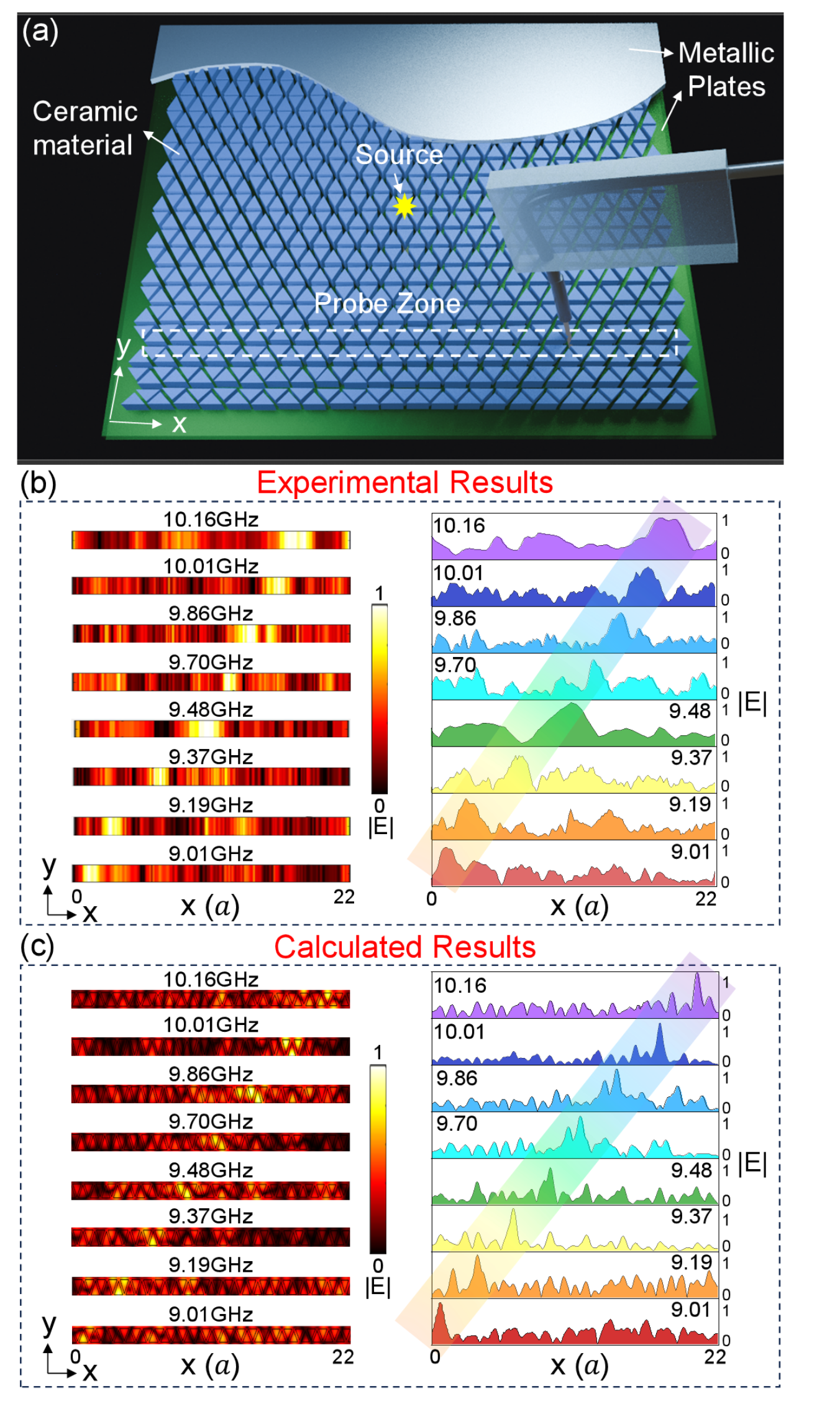 图3. (a)微波近场实验测量装置。(b, c)实验观测和仿真计算的朗道彩虹现象。