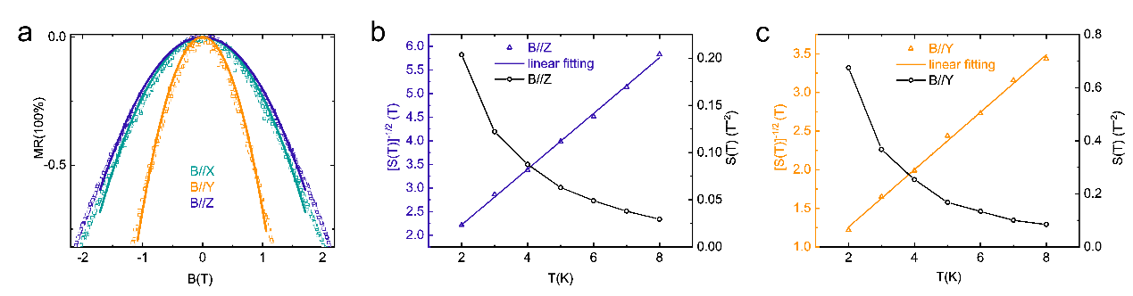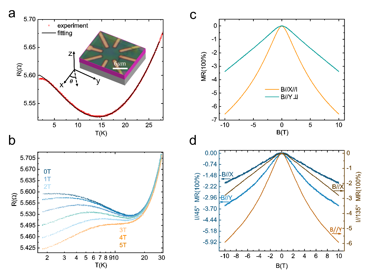 太阳集团tcy8722段俊熙副教授、姚裕贵教授团队长期致力于新型拓扑和量子材料的输运性质研究。为了实现这种异维近藤超晶格,研究团队选择了拥有丰富磁学性质的过渡金属二硫化物VS2- VS异维超晶格作为候选材料。该结构由太阳集团tcy8722的周家东教授最先合成[Nature 609, 46–51 (2022)]。研究中,我们发现:(1)在VS2- VS异维超晶格观察到了电阻关于温度的对数依赖关系以及负磁阻,即近藤效应的典型特征。有趣的是这两者对磁场的依赖关系表现出强烈的各向异性,如图1所示;(2)利用圆盘型器件,确定了各向异性的负磁阻来源于近藤效应的各向异性磁场依赖,如图2所示;(3)通过提取朗德g因子及居里温度,结合第一性原理计算,证实了近藤效应的各向异性磁场依赖来源于维度引起的各向异性磁性,如图3所示。
