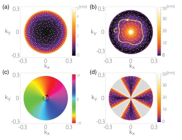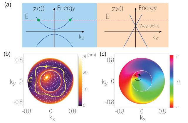 图 2:(a)普通金属和外尔半金属所构成的模型示意图。(b)反常位移在界面动量空间的矢量场。箭头代表矢量的方向,颜色代表矢量的绝对值。(c)反射振幅的相位随界面动量的变化。