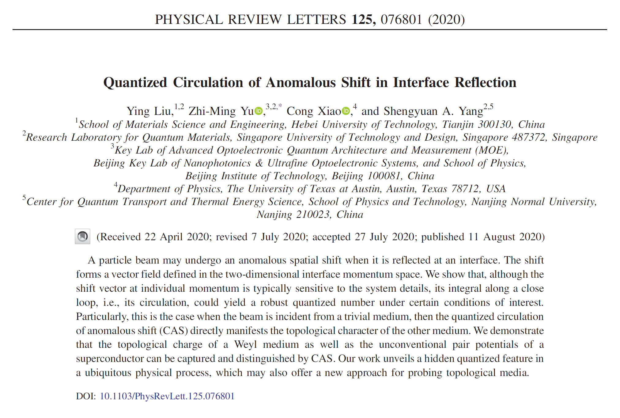 该文章发表于物理学顶级期刊《Physical Review Letters》,作者为刘影、余智明(通讯作者)、肖聪和杨声远(Ying Liu, Zhi-Ming Yu*, Cong Xiao, and Shengyuan A. Yang),Physical Review Letters 125, 076801 (2020)。
