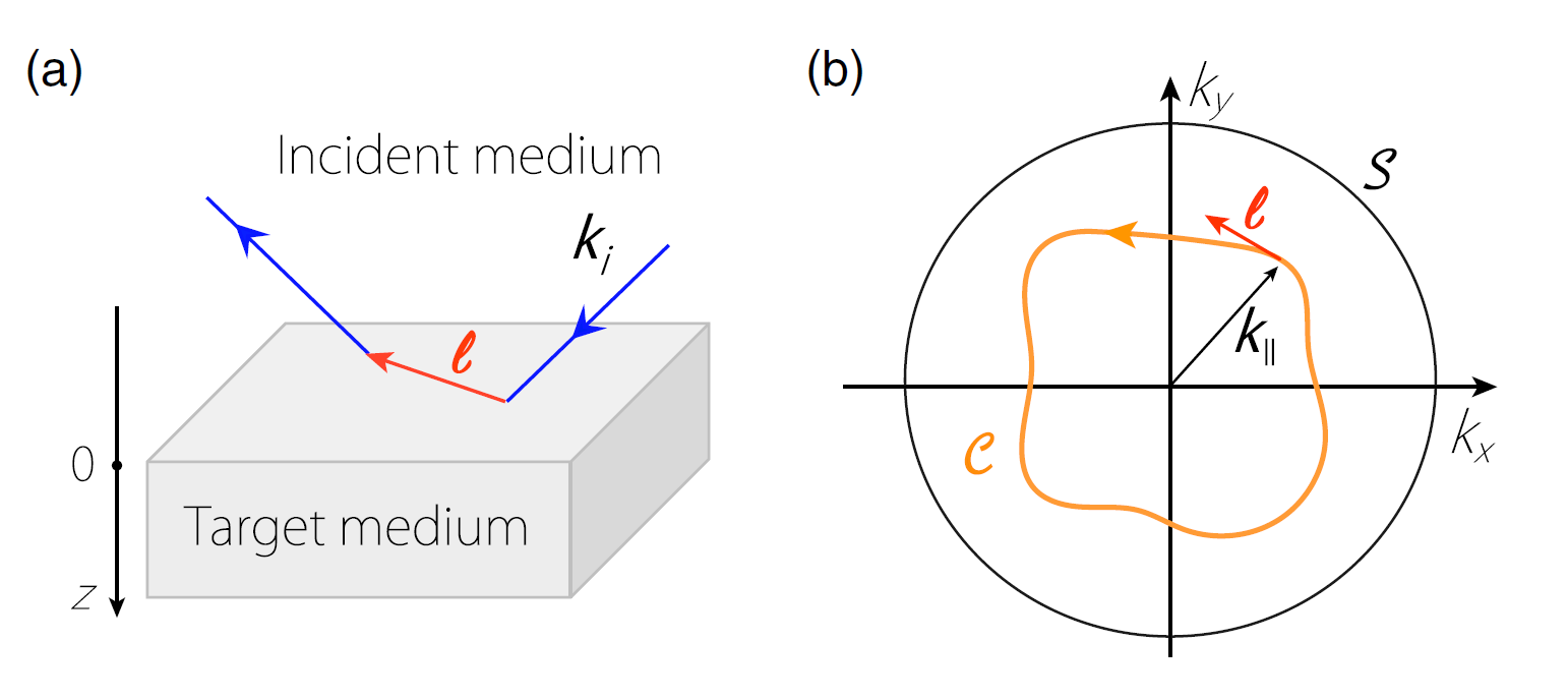 图 1:(a)界面反射中反常位移的示意图。蓝色线段表示入射和反射的电子流,红色线段代表反常位移。(b)反常位移是随界面动量变化的一个矢量。C代表反常位移在界面动量空间中的环路积分。