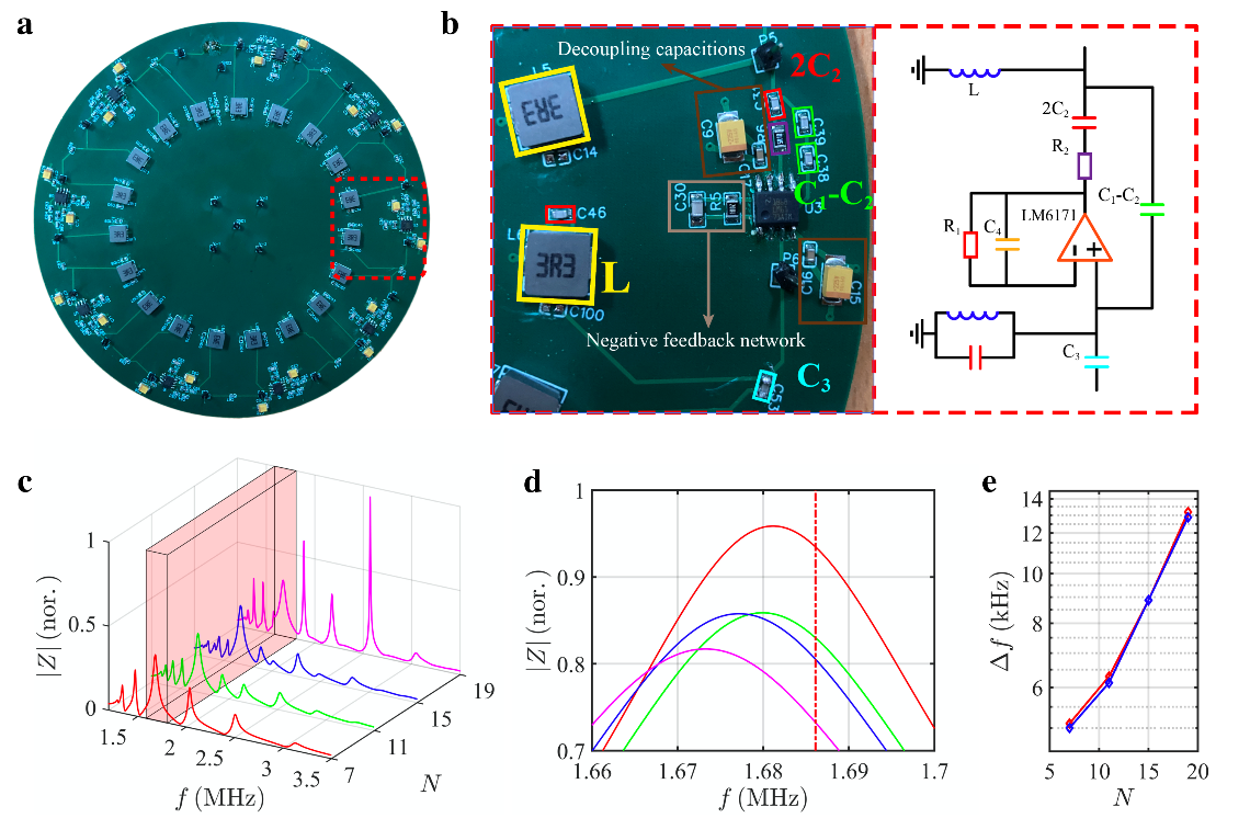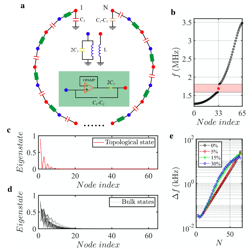 研究人员制备了四种不同长度的非厄米拓扑电路,包括N=7、N=11、N=15和N=19。图2a展示了N=19的电路样品。通过测量电路阻抗相应,可以得到由边界扰动导致的电路拓扑零能模频移,如图2c所示。四种不同颜色的线与四种不同长度的非厄米拓扑电路相对应,所测得的阻抗响应均位于电路的边界格点。此外,红色矩形标注了拓扑带隙的频率范围," 该频率范围内的阻抗响应显示在了图2d中。其中红色虚线用来标记开放边界下电路中拓扑零能模的频率。上述结果清楚地表明,与拓扑零能模对应的阻抗峰的频率偏移随着电路长度的增加而明显增加,这意味着电路长度的增加将带来敏感性的显著增强。图2e中的蓝线进一步说明了测量的频率偏移和电路长度之间的关系。与之相对应的理论模拟结果(红线所示)与实验结果之间有着良好的一致性。